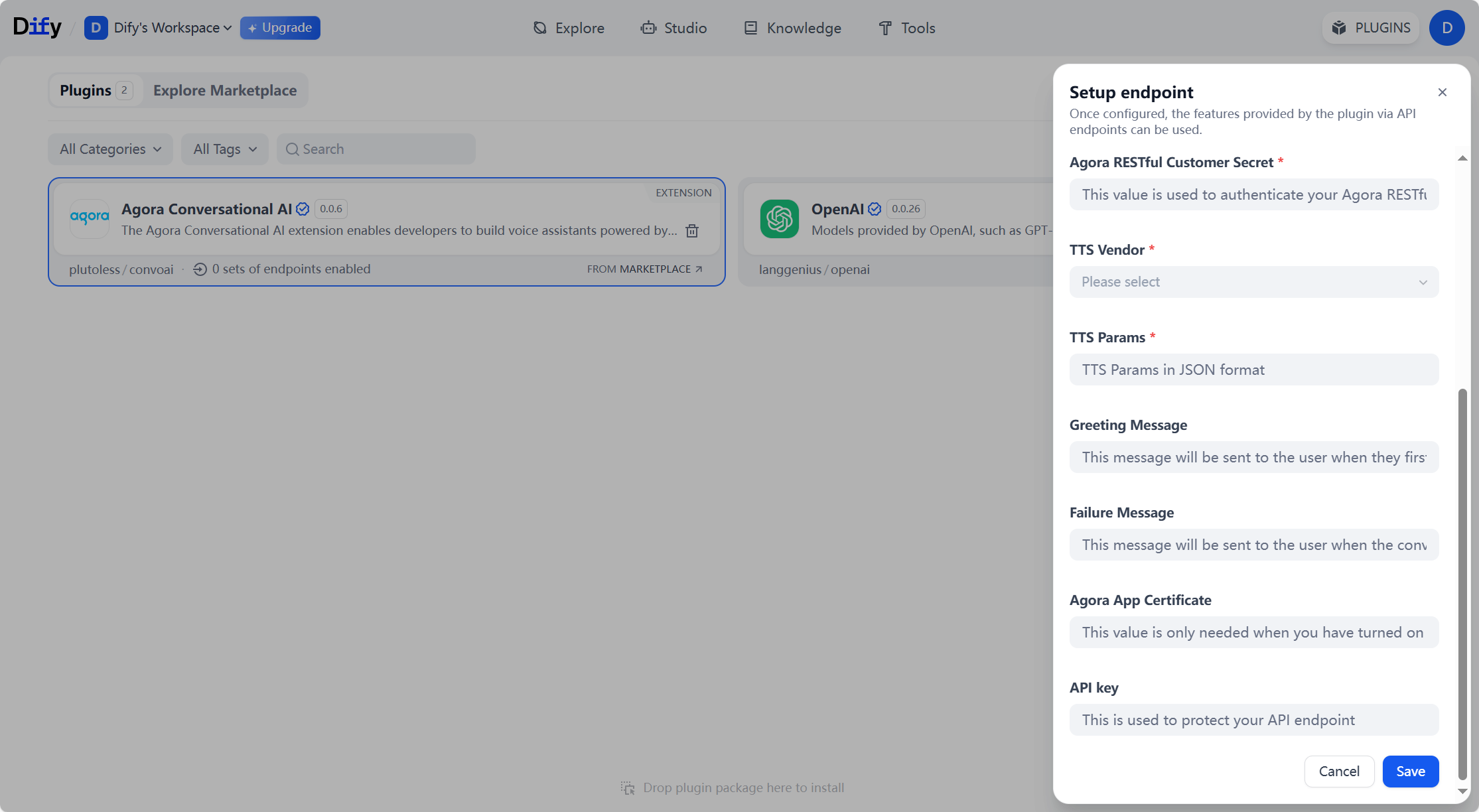 To integrate Dify with Agora Conversational AI, install the plugin, configure your Agora project, and create an endpoint: