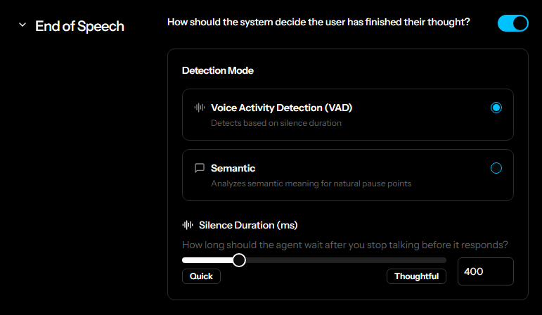 Controls how the system decides the user has finished their thought.