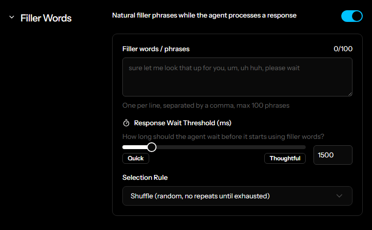 When enabled, the agent uses natural filler phrases while processing a response, reducing awkward silences.