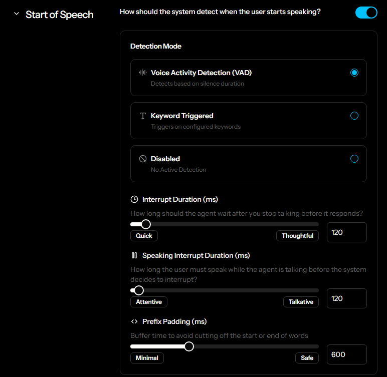 Controls how the system detects when the user starts speaking.
