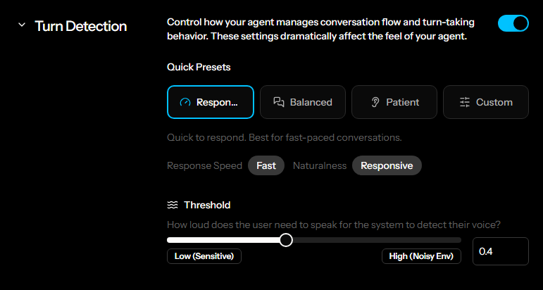 Turn detection controls how the agent manages conversation flow and turn-taking behavior. Use the Quick Presets to get started quickly, or select Custom to configure individual parameters.