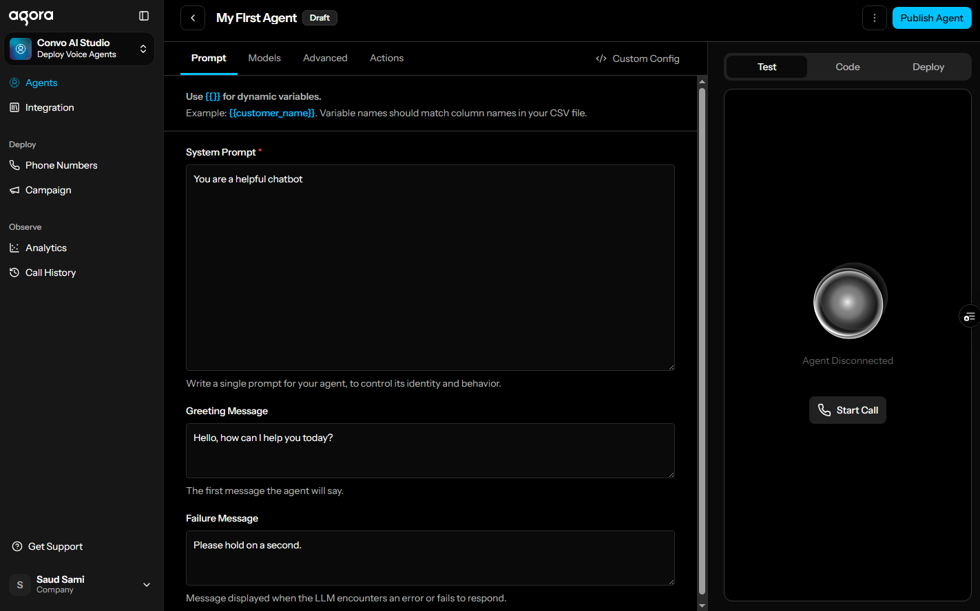 - Customize your agent: Fully configure models, prompts, and advanced settings for your use case