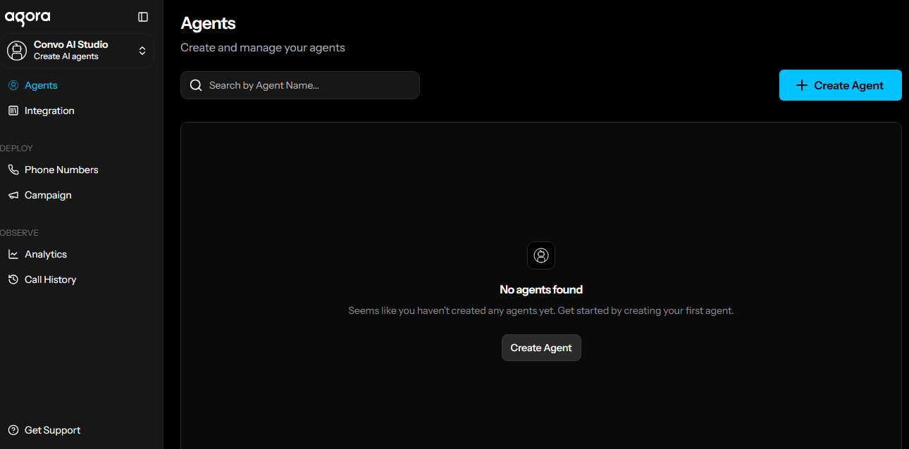 Select an Agora project from the dropdown. The agent uses this project's credentials to connect to Agora, and usage is billed to this project.